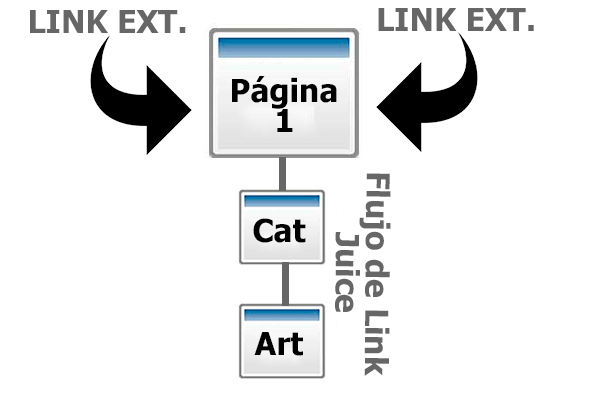 El linkjuice sería la fuerza que se va pasando de un artículo a otro a través de los enlaces. Estos pueden ser de una web a otra, a través de enlaces externos, o entre varios artículos dentro de una misma web con enlaces internos.