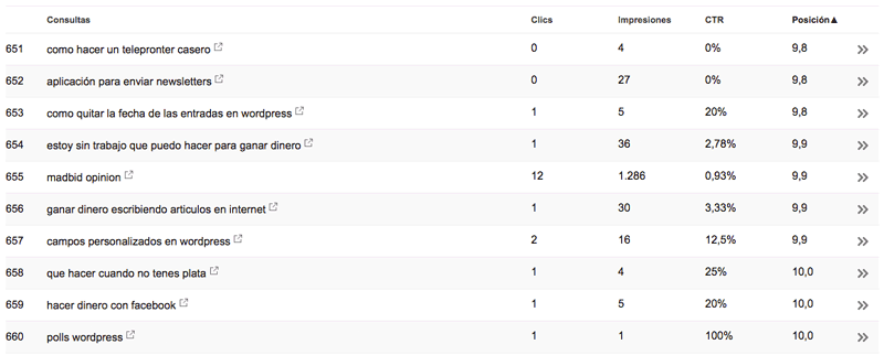 Es increíble como en search console se puede ver las palabras claves por la que se posiciono este sitio web.
