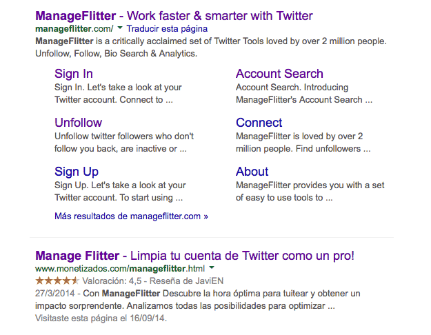 Como vemos, en Google aparece la página de la herramienta Manageflitter y acto seguido la de mi blog ? .