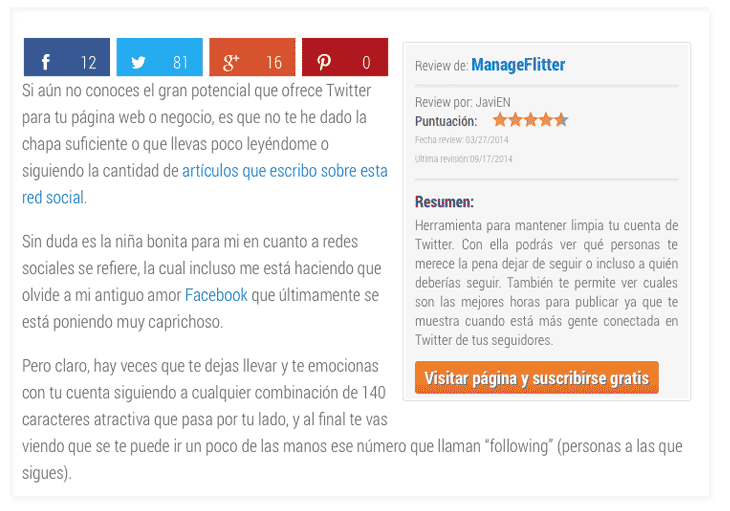 La ventaja es que es gratutito, pero la pega es que en esa versión sin pagar solo podrás ofrecer que se comparta en Twitter y Facebook. Si quisieras que se comparta en Google+ por ejemplo, tendríais que optar por la versión de pago.