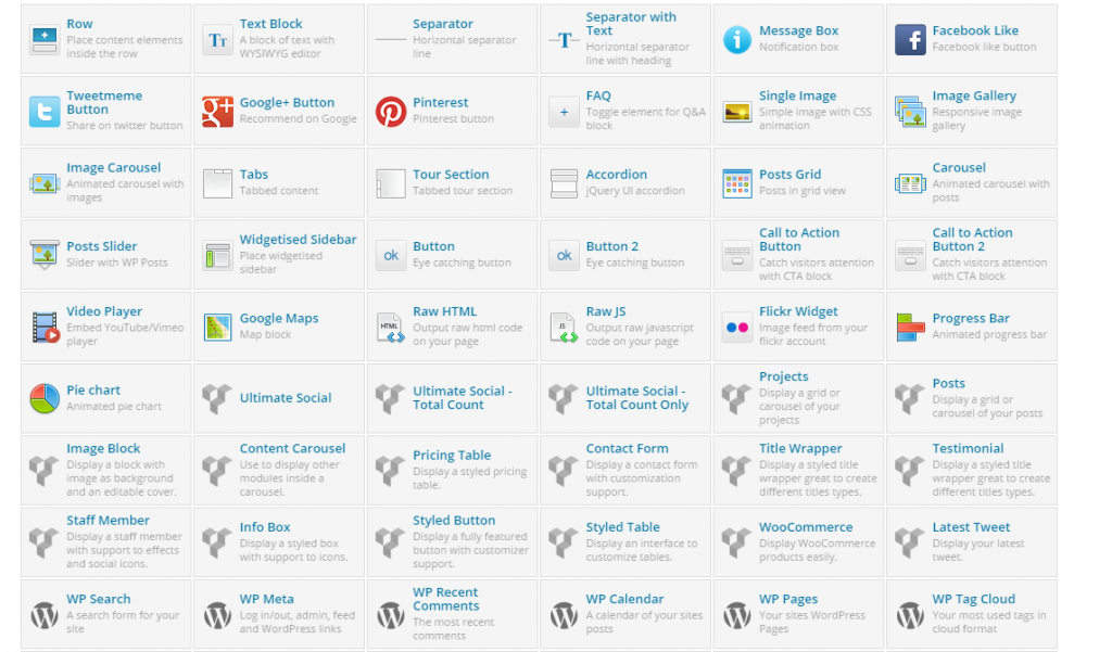 Aquí puedes ver una imagen con algunos de los elementos que puedes insertar cómodamente en tu post o página de WordPress gracias al plugin Visual Composer: