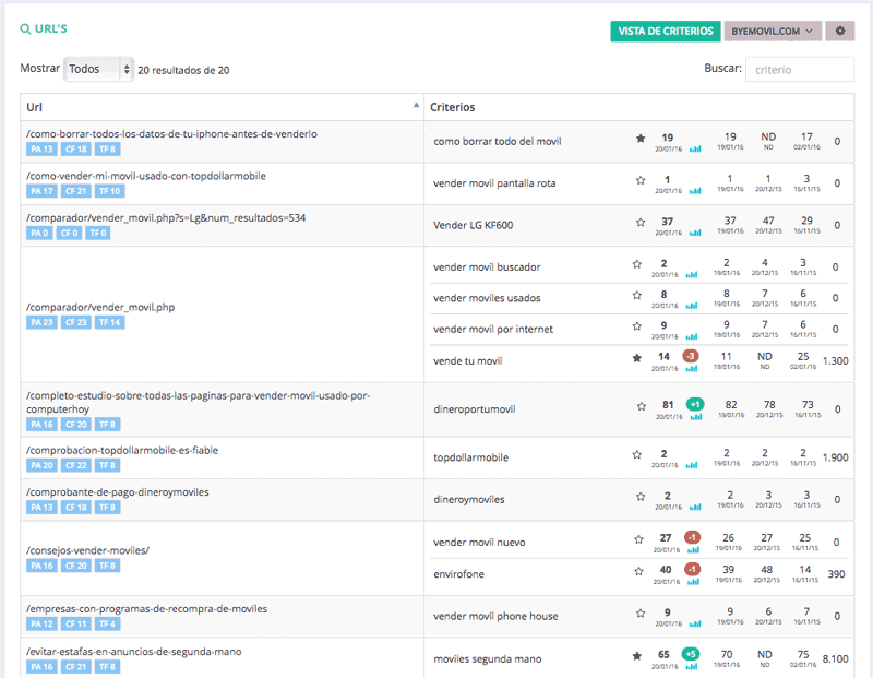 Ahí, en vez de ver las palabras clave a la izquierda, ves las URLs de tu página y a la derecha las palabras clave para las que estás posicionado en cada una de ellas, de las que has definido.