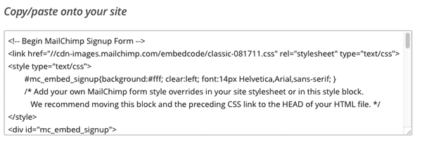 Ahí se nos abrirá una pantalla  que será donde deberemos copiar el código del formulario de Mailchimp.