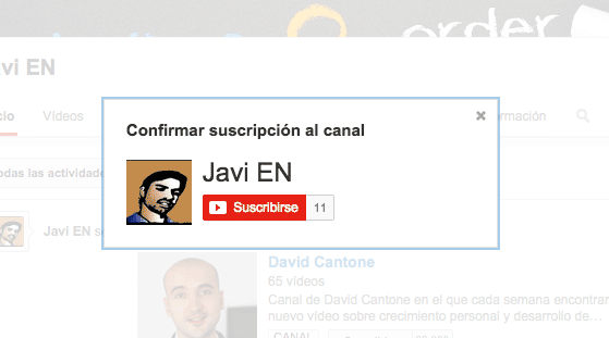 Habrás visto que al entrar en mi canal, ha salido una ventana que directamente te invita a suscribirte. Esta pinta de esta forma: